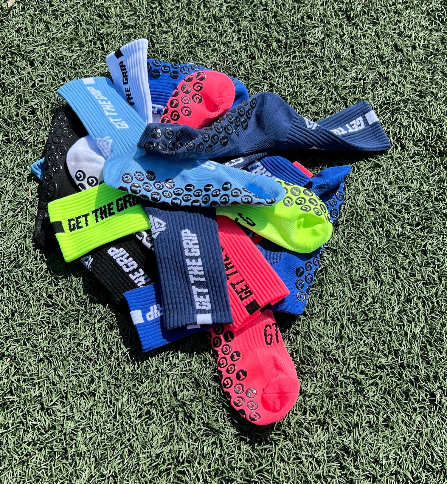 Get The Grip Socks are specially made and engineered socks that create an extra layer of grip between your foot and the sole of your shoe. These socks can be worn in sports such as Football, Netball, Volleyball, Basketball, Baseball, Running, Cycling, Hiking, Rock Climbing, Golf and others. They can also be used in everyday lifestyle to work or school for general comfort and antiblister.